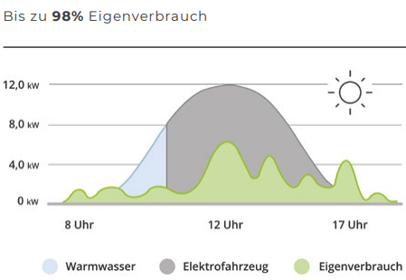 Mit einer Photovoltaikanlage ohne Energiemanagementsystem werden nur rd. 32 % der erzeugten Energie direkt genutzt. Der intelligente Energiemanager erhöht die Eigenverbrauchsquote auf bis zu 98 % (siehe Grafik).