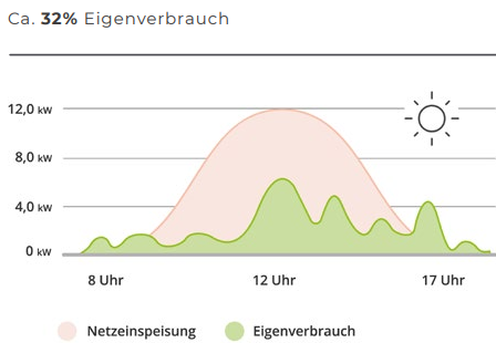 Mit einer Photovoltaikanlage ohne Energiemanagementsystem werden nur rd. 32 % der erzeugten Energie direkt genutzt. Der intelligente Energiemanager erhöht die Eigenverbrauchsquote auf bis zu 98 % (siehe Grafik).